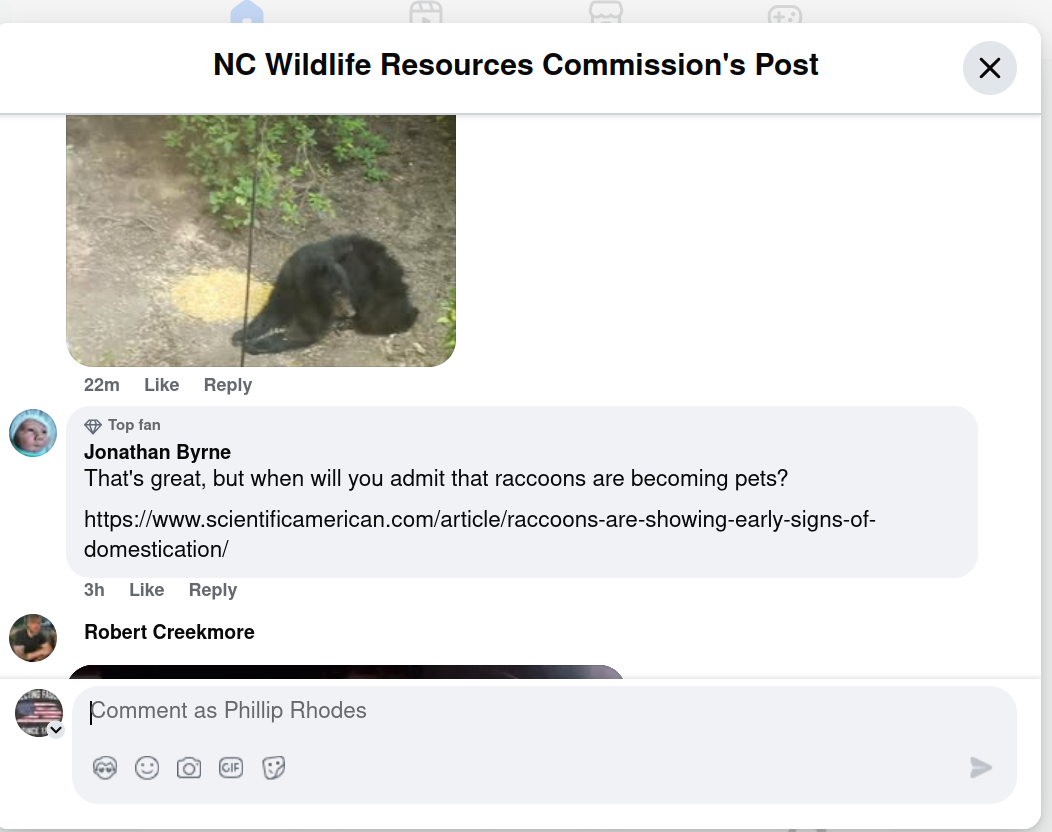 On Facebook, there's been this running gag/joke/meme/whatever going for at least the last year, where anytime the official North Carolina Wildlife Resources Commission page posts anything, a large portion of the comments quickly turn into a discussion of the merits (or lack thereof) of pet raccoons[1].
